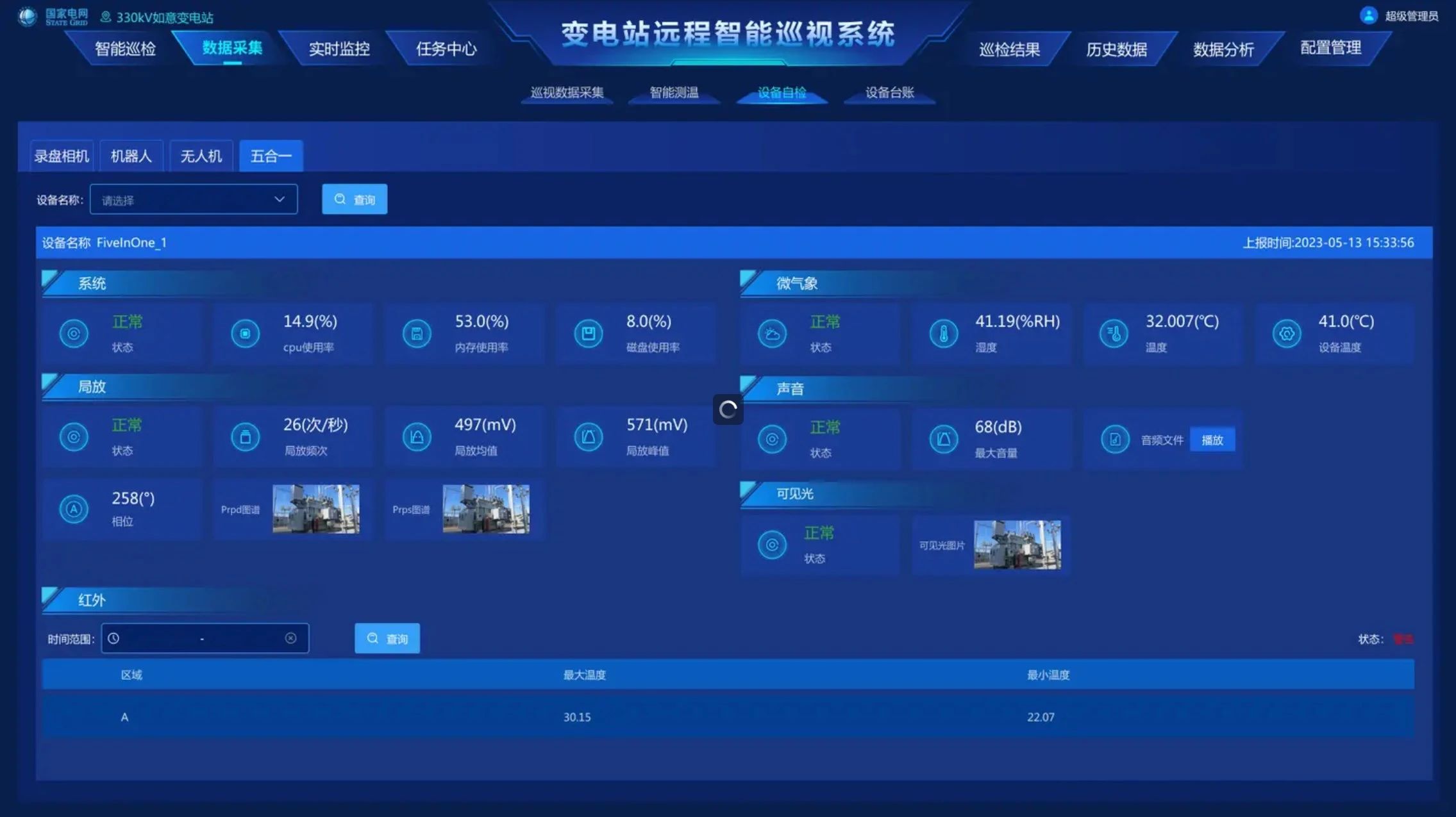 通過(guò)機(jī)器人系統(tǒng)、高清視頻系統(tǒng)、紅外在線系統(tǒng)、聲紋采集裝置等方式聯(lián)合采集巡視數(shù)據(jù),完成變電站全面運(yùn)行數(shù)據(jù)采集,構(gòu)建數(shù)字化變電站數(shù)據(jù)基礎(chǔ)。具備表計(jì)識(shí)別、設(shè)備外觀識(shí)別功能完成30多類電力設(shè)備狀態(tài)分析,20多類典型缺陷識(shí)別,有效輔助人工完成現(xiàn)場(chǎng)巡視工作。