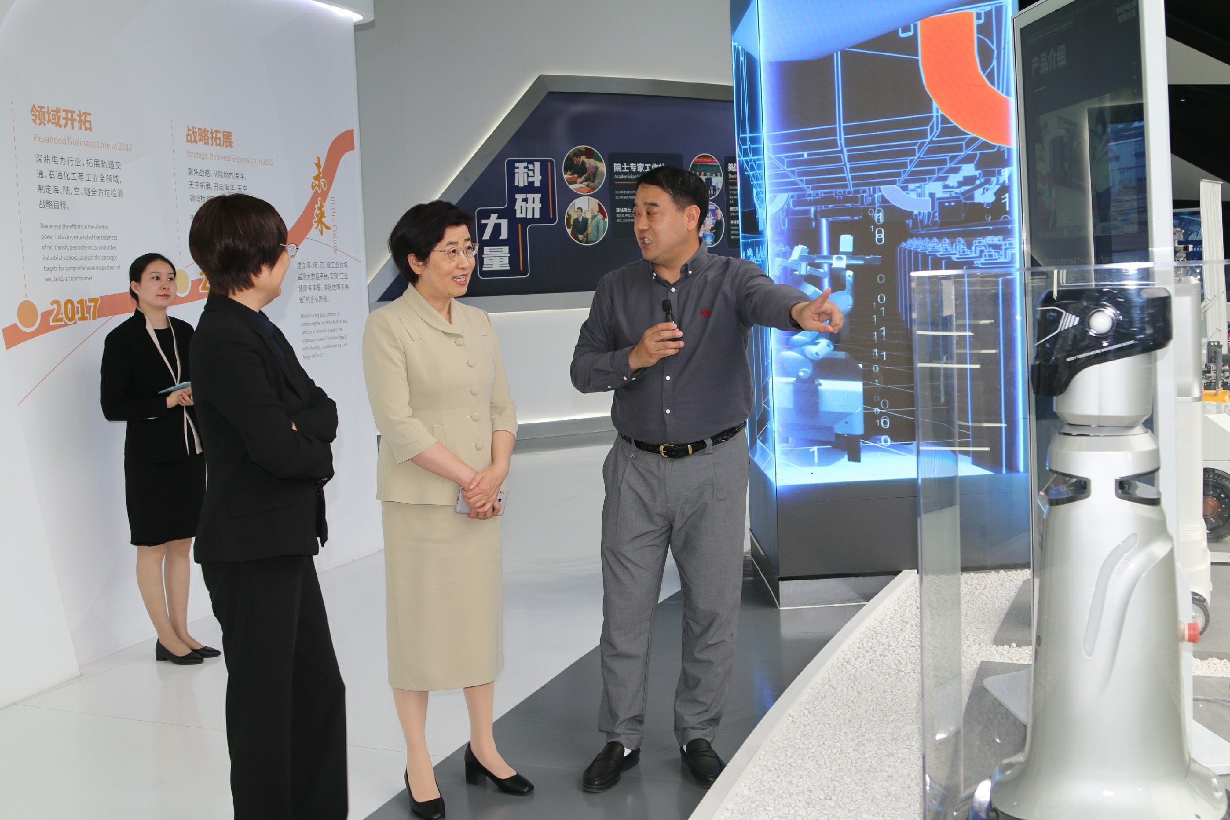 陳常務(wù)副市長一行參觀了電力館、軌道交通、石油石化館、未來館、數(shù)據(jù)中心,考察了申昊科技的前沿技術(shù)、創(chuàng)新成果及人工智能產(chǎn)品應用情況。